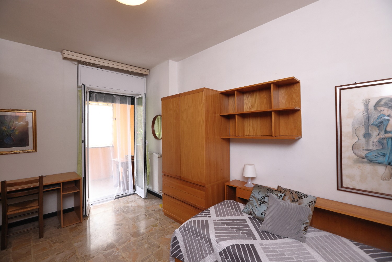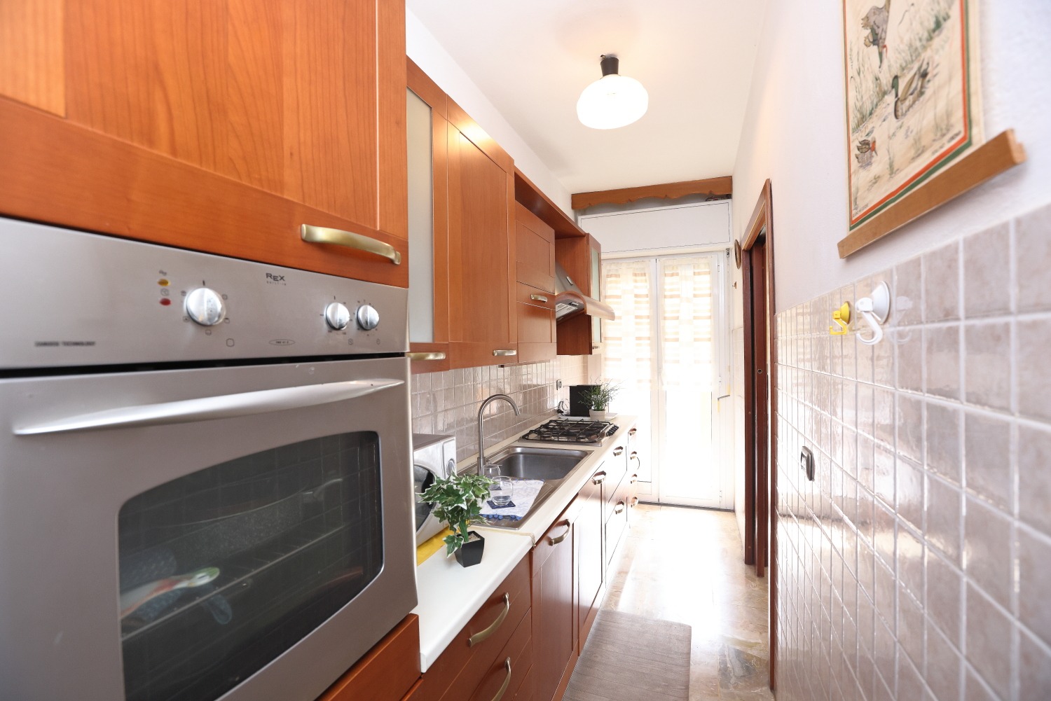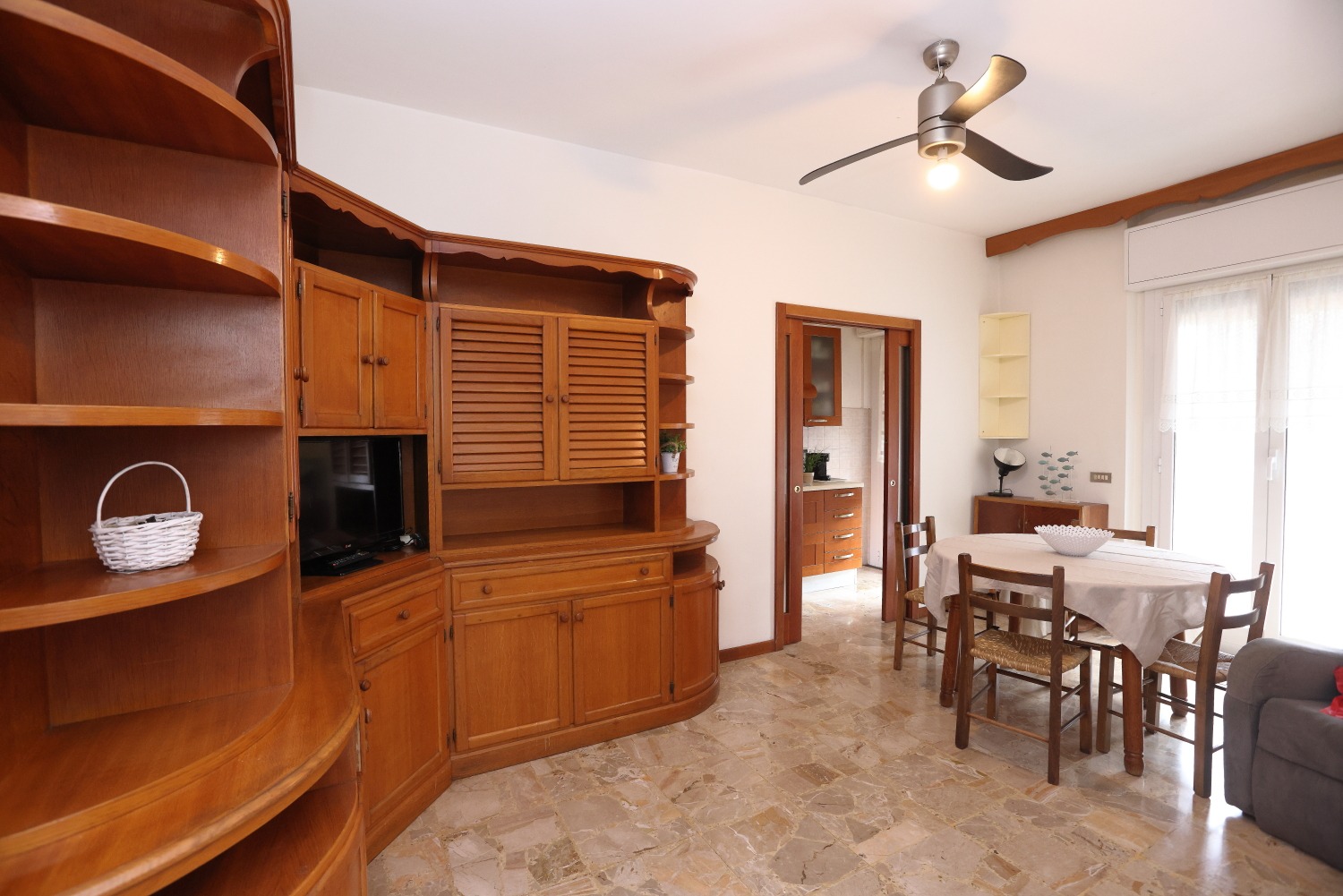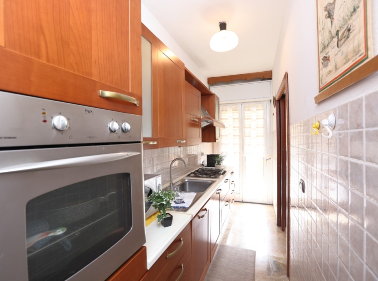 Gli spazi colpiscono subito per ampiezza e luminosità: quattro camere da letto, bagno finestrato e una zona giorno in cui soggiorno e cucina comunicano attraverso pratiche porte scorrevoli, donando continuità e flessibilità all’intero living.